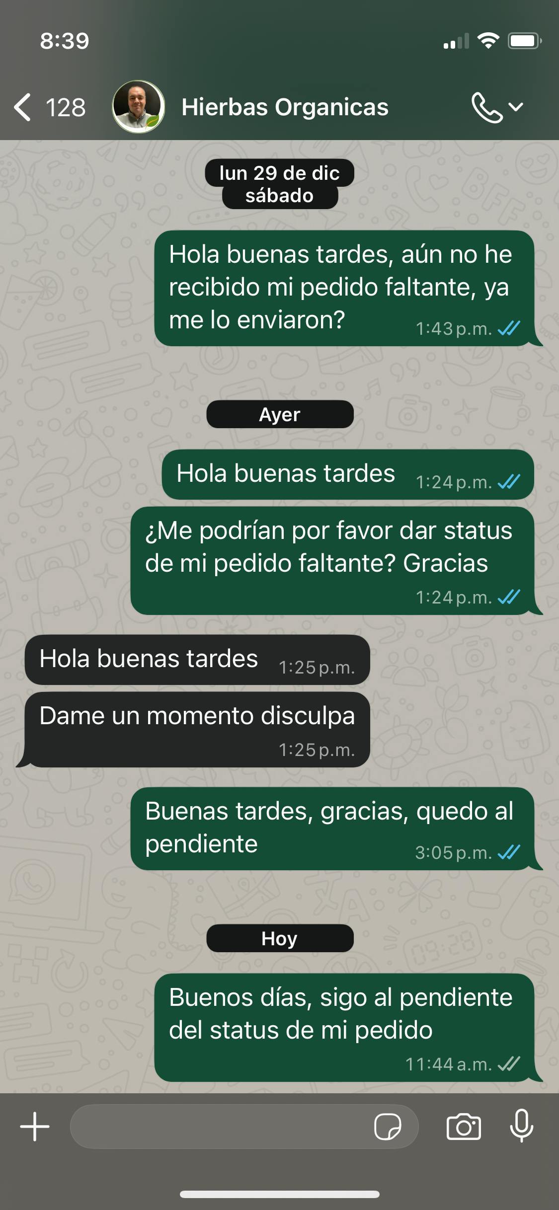 No recibí mi pedido completo, me aseguraron una fecha para recibir los paquetes faltantes y no se cumplió, he solicitado que me den status de mi pedido y no he recibido respuesta. Estoy construyendo un negocio de herbolaria y un proveedor que no cumple con la entrega de lo que ya pagué y necesito, me dificulta la fluidez en mi negocio.